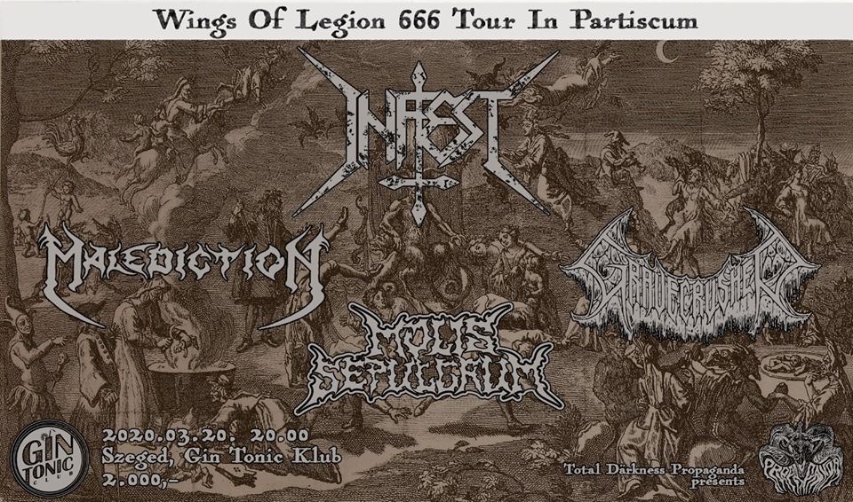 A death/thrash vonalas szerb Infest március 20-án a szegedi Gin Tonic Klubban játszik majd, és ez lesz a Wings Of Legion 666 turné egyetlen hazai állomása. Hazai bandák is felsorakoztak az eseményre, a Malediction, a Gravecrusher és a Molis Sepulcrum.