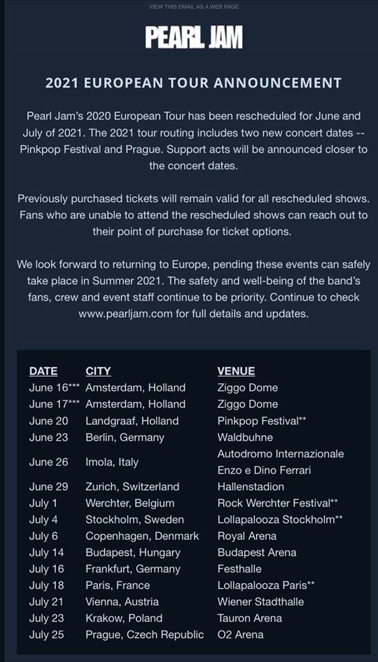 A Pearl Jam 2020 nyarára tervezett európai turnéját a jelenlegi körülmények miatt átszervezték 2021 júniusára és júliusára. A 2021-es koncertkörút 2 új fellépéssel is bővült – a holland Pinkpop fesztivállal, illetve egy prágai koncerttel.